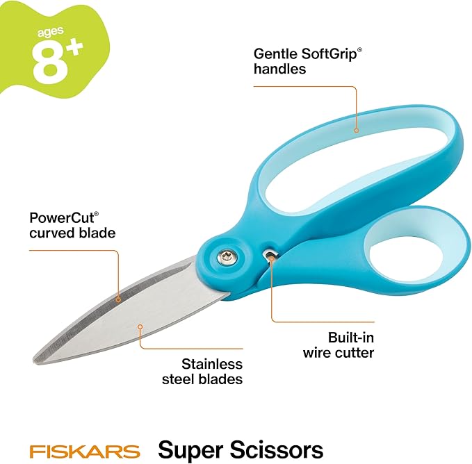 Fiskars Kids Super Scissors – Cutting Power for Cardboard, Foam, Felt & More with SoftGrip Handles, For Crafting and School Supplies, 6 inches