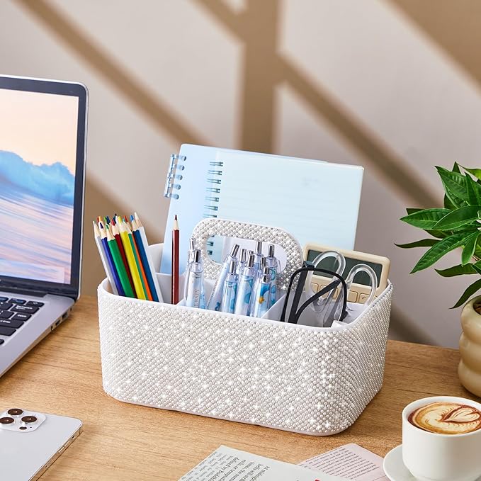 Marspark Bling Makeup Caddy Organizer with Handle, Sparkly Art Craft Holder, Glitter Bathroom Hair Caddy, Shimmer Pen Pencil Holder for Women Desk Organizer, Bling Gifts for Women(White,Pearl Diamond)