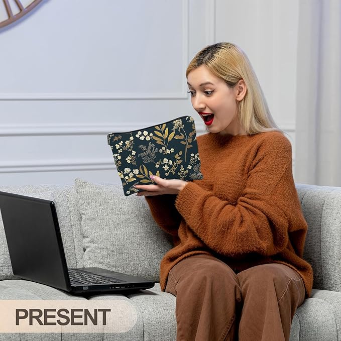 Vintage Boho Floral Makeup Bag, Dark Moody Wildflowers Floral Cosmetic Bags for Women, Dark Cottagecore Botanical Plant Zipper Makeup Pouch