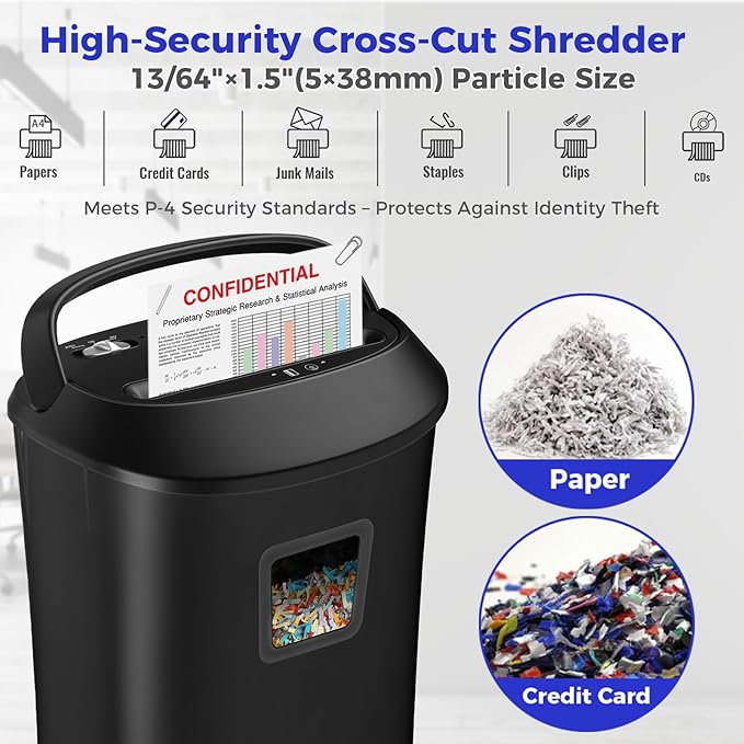 • 【P-3 High Security level】This crosscut paper shredder takes max 14-sheet of 20-pound bond paper down to 0.19 inches by 1.5 inches (5 by 38 mm) at a time, no need to remove staples or clips. Also shreds credit card, CD, junk mail (one at a time)