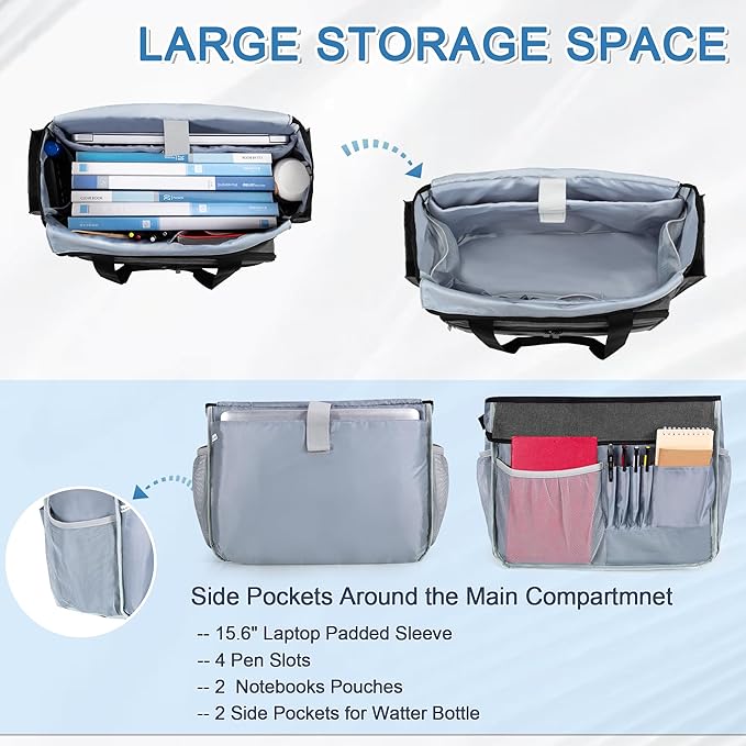 • 【Great Storage Assistant】 The spacious main compartment is equipped with 3 mesh pockets, 1 padded laptop sleeve, 4 pen slots, 1 phone sleeve to keep your teaching supplies and accessories organized.