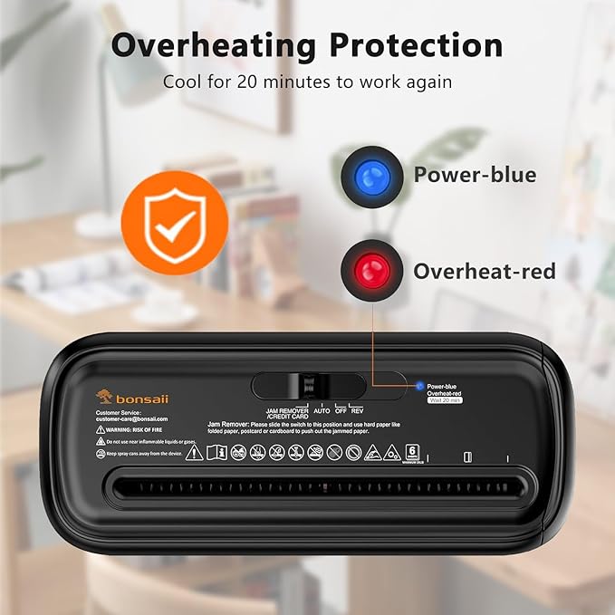 • Smart Motor Protection: Built-in overheat protection safeguards the motor during extended shredding sessions, automatically pausing operation if necessary and resuming once cooled. Recommended duty cycle: 2 minutes ON / 20 minutes OFF for optimal longevity.