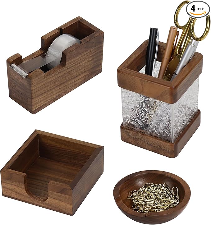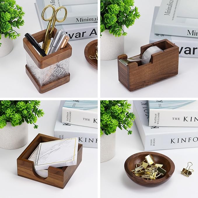 • 【Product Features】: ① wood post It note dispenser with 4 anti-slip mats for firm, non-damaging grip; sticky notes easy to remove, holder stays stable, ② desktop tape dispenser with sharp blade for quick cuts, not one-handed. Walnut tape dispenser: lightweight, easy for two-handed use. ③ wood pen cup: crafted from walnut wood and semi clear acrylic presents a hazy visual effect.④ paper clip holder for desk can be used for small office items.