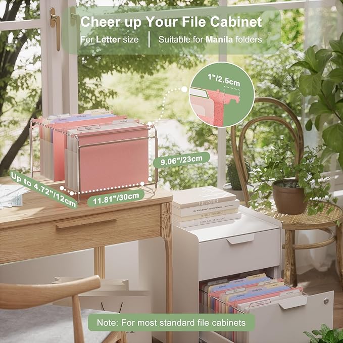 • EXPANDABLE POCKET, LARGE CAPACITY:This wheat straw expanding hanging file folder features a single pocket with a bottom that expands up to 4.72"(12cm). Designed for Letter-size files and most standard file cabinets (L: 11.81"/30cm, H: 9.06"/23cm, fits MANILA folders). The extended 1"/2.5 cm hooks adapt to more file cabinets. The expandable design grows with your files, preventing wear and tear.