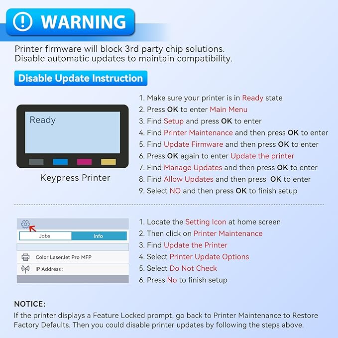 • Compatibility Alert: 148X toner cartridge is NOT Compatible for Suffix with Letter "e" such as: Pro MFP 4101fdwe/ 4101dwe/ 4101fdne, Pro 4001dwe/ 4001dne/ 4001ne. Please confirm your printer model before purchase