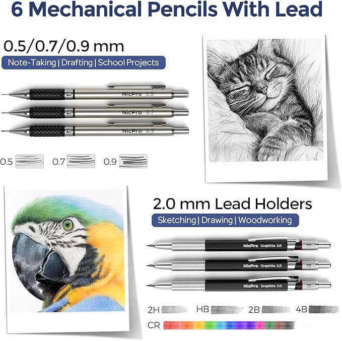 • 6 Mechanical Pencils with Various Lead Refills: This 6 pcs metal mechanical pencil come with a large number of refills for various line widths: 0.5/0.7/0.9/2.0,the 2mm graphite pencil come with 4 hardness lead (2H/HB/2B/4B) to create different darkness. Ideal for sketching, drafting, shading, and detailed technical drawings. Smooth writing, break-resistant, and great for all levels
