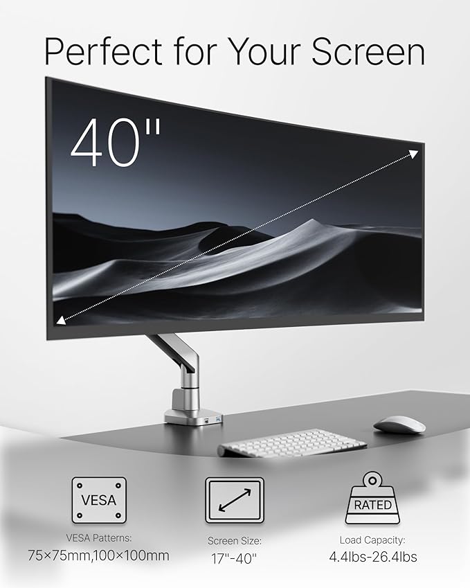 • Universal Fit Monitor Arm: This single monitor arm confidently supports 17 to 40 inch flat and curved monitors, holding up to 26.5lbs for steady daily use and is perfect for mainstream office, home, and entertainment screens in this size range. It comes with a universal quick-release VESA bracket, fully compatible with industry-standard 75x75mm and 100x100mm mounting patterns to ensure seamless setup with your monitor.​
