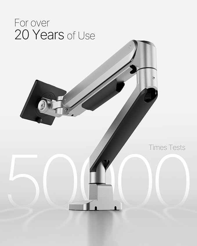 • Sleek Aesthetic Meets 20-Year Durability:Experience two decade of flawless performance while our single monitor arm delivers just as impressively and is backed by premium materials and rigorous testing. Unlike ordinary monitor arms, ours features a scratch-resistant aluminum body and is equipped with a high-end mechanical spring proven through 50,000 cycles. This ensures smooth adjustments every day for over 20 years. What’s more, its sleek decorative design blends seamlessly with any workspace decor, making it the most reliable and visually appealing partner for your workspace.​