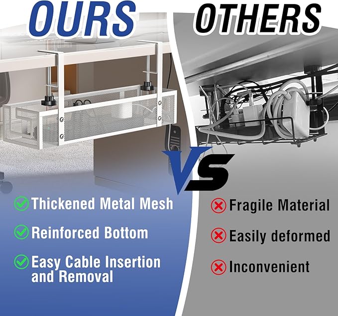 • 【Durable & Heavy-Duty Construction】Made of premium carbon steel, this cable management under desk features a reinforced metal mesh and a sturdy bottom. It supports up to 15lbs and measures 15.75" Lx4.72" Wx3.15" H, ensuring reliable and long-lasting use.