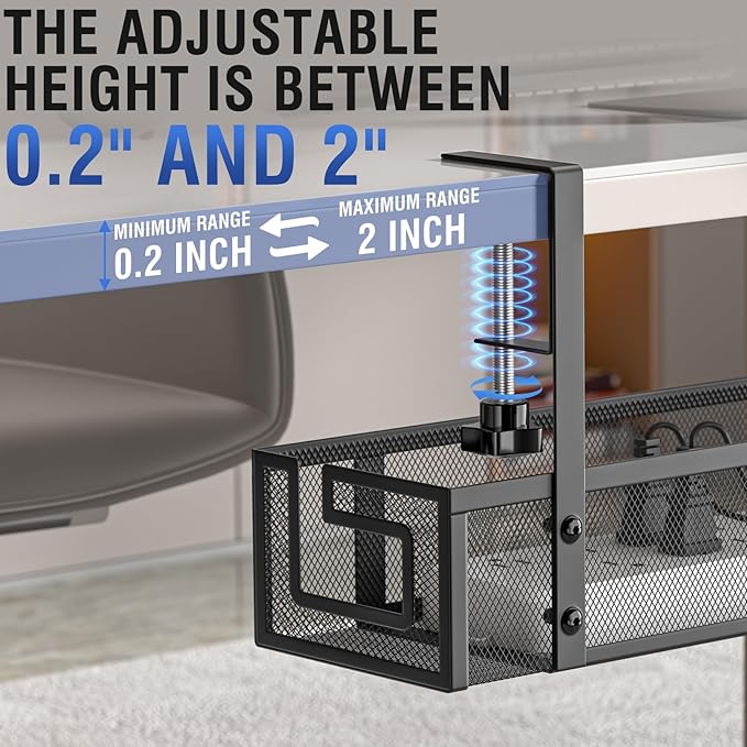 • 【Compatible with Various Desk】 Suitable for flat-edged table tops with a thickness between 0.2 and 2 inches. Please measure your desk's thickness beforehand and verify the dimensions of your power strip to ensure compatibility with this desk organizer.