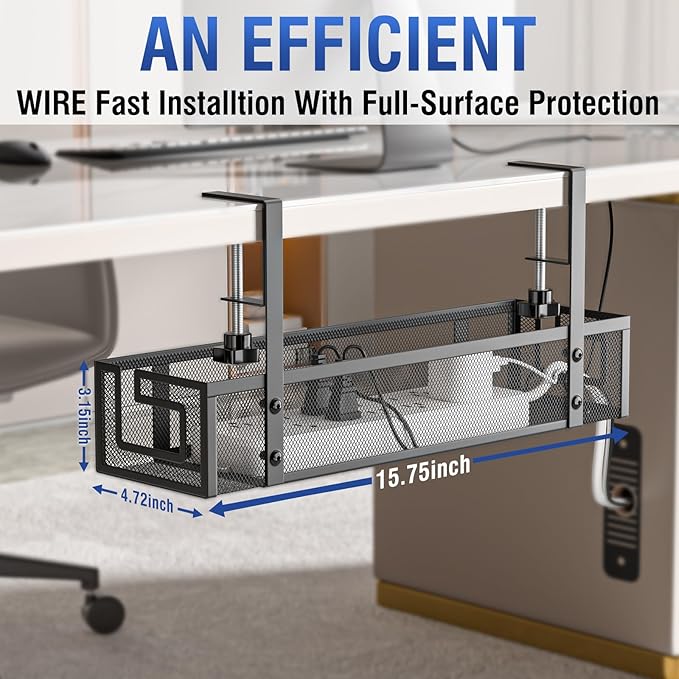 • 【Durable & Heavy-Duty Construction】Made of premium carbon steel, this cable management under desk features a reinforced metal mesh and a sturdy bottom. It supports up to 15lbs and measures 15.75" Lx4.72" Wx3.15" H, ensuring reliable and long-lasting use.