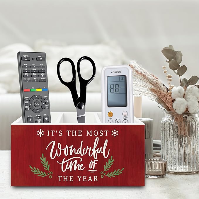 Red Christmas Pen Pencil Holder Organizer for Desk, Christmas Office Decor, Winter Xmas Wooden Box Sign for Home Office Desk Tabletop Decorations