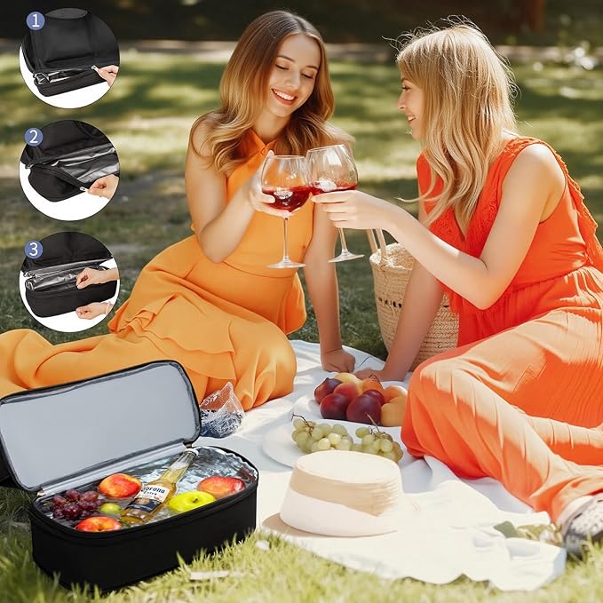 • Bottom Collapsible & Insulation Cooler Layer: Thickened PEVA liner and seamless hot-pressing technology to prevent leakage. The inner liner has insulation and thermal insulation effects, is perfect for keeping the food warm and drinks cold(put some ice cubes), but also as a waterproof bag to keep your travel essentials dry, making your trip more convenient and relaxed