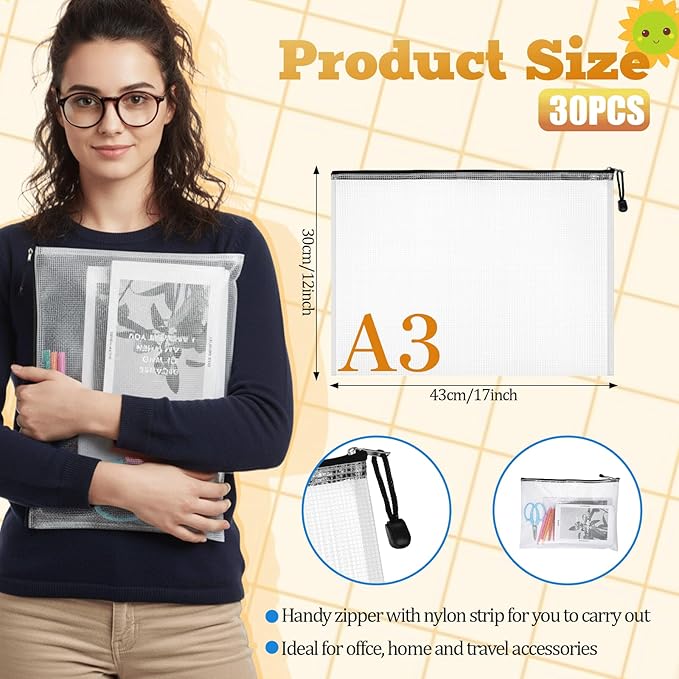 • PACKAGE INCLUDES: 30 pcs 17 inches * 12 inches / 43cm * 30 cm large size A3 mesh zipper bags in black, help you organize your daily life and work clutter. Sufficient quantity to meet the needs of daily work and life, also share with your family, friends, and colleagues.