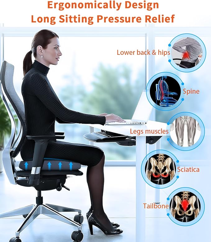 • 🦼【Never Lose It's Shape】:It has ergonomic design and the perfect 3D contour curve to fit butt shape, reducing pressure of bone during sitting, helps improve posture and maximize support and comfort to sit for long periods of time, promoting healthy posture perfectly. You can sit on the back & seat cushions everyday and never worry about flattening.