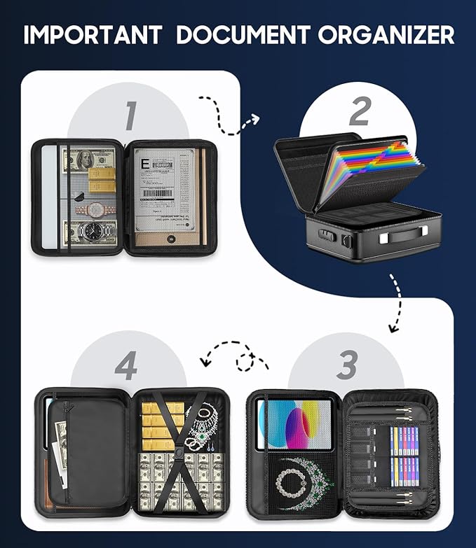 • Upgraded Stylish Hard-Shell Design: The upgraded hard-shell document organizer breaks through traditional limits by integrating a high-strength hard shell structure with professional fireproof materials. Compared with conventional soft file box, this upgraded design withstands extreme environmental impacts while maintaining an elegant & professional appearance through its dust-proof & stain-resistant surface. Wise choice for your important documents, laptop, and valuables.