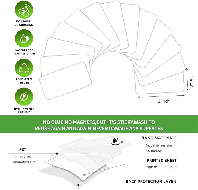 • 💖Really Reusable Dry Erase Labels - SVNOOC dry erase sticky notes are made of Freon-free Nano Material and dry erase film, can be reused up to10,000 times each. Smooth writing and wipe off easily, no glue, no magnetic but can stick well, heat resistant, microwave safe, just WASH to Renew if get dirt or stickless