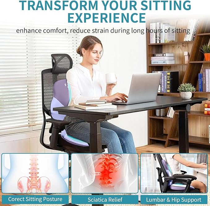 • Pressure Relief for Enhanced Comfort: Enjoy all-day comfort with our ergonomic seat cushions and lumbar support pillows, designed to reduce discomfort in the lower back, tailbone, and sciatic nerve. Promote a healthier sitting posture and make long hours of sitting more enjoyable.