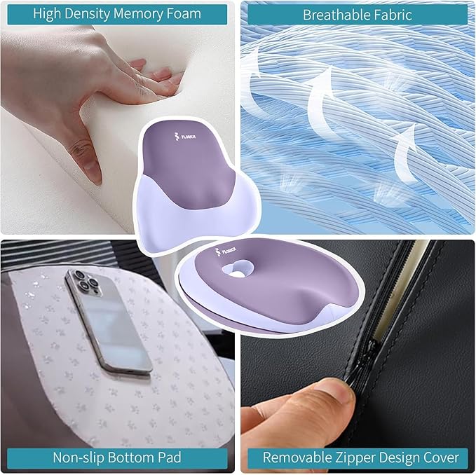 • User-Friendly Details for Pain Relief: Our office seat cushions feature a 3D contoured design that evenly distributes pressure on the hips and legs, alleviating discomfort. With a non-slip bottom to prevent shifting and W-shaped leg support to reduce numbness, chair seat cushion promoting airflow through its hollow slot design, prevent sweating due to prolonged sitting.