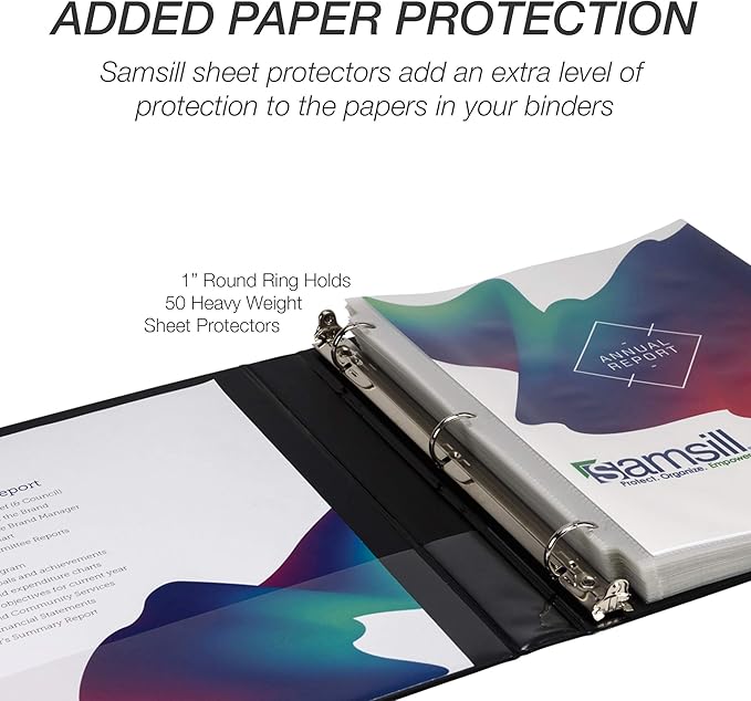 • Heavy-Duty 3-Ring Binders: Built to withstand frequent handling in classrooms, offices, and professional settings, these1-inch durable binders securely hold up to 200 sheets of standard 8.5" x 11" paper. The robust round-ring design provides smooth page turning with reinforced hinges for long-lasting reliability. Equipped with two clear interior pockets, they’re ideal for keeping important documents, project materials, or office essentials organized and secure